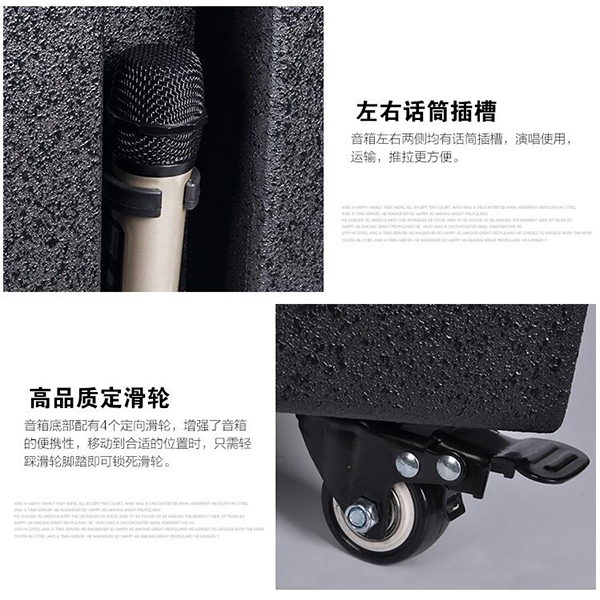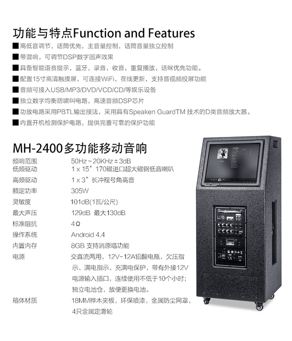 沐鸣2音响设备MH-2400与之前政府采购的MH-2400拉杆音箱有些许不同,在外形上更加大气稳重,音箱左右两侧均有话筒插槽,演唱使用,运输推拉更方便,15寸高清触摸屏搭载安卓4.4系统,内置商店涵盖海量软件,大功率数字功放板,功能上在原有的基础上添加了WIFI连接可在线下载MTV歌曲内置8GB储存支持消原唱功能,手机音视频投传,可以无线传输手机音视频信号到液晶显示屏上,材质压缩木板,金属防尘网罩,音箱底部配有四个定向滑轮,增加了音箱的便携性,移动到合适的位置时,只需轻踩滑轮脚踏即可锁死滑轮。让上海市广大群众更加热忠参与集体活动,唱出更美的歌曲。