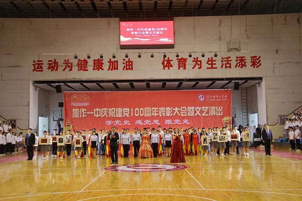 为了庆祝建党百年华诞,庆祝中国共产党成立100周年,深情讴歌党走过百年历程创造的丰功伟绩,继承和发扬党的光荣传统和优良作风6月22日下午,焦作一中党委在学校体育馆隆重举行“焦作一中庆祝建党100周年表彰大会暨文艺演出”。